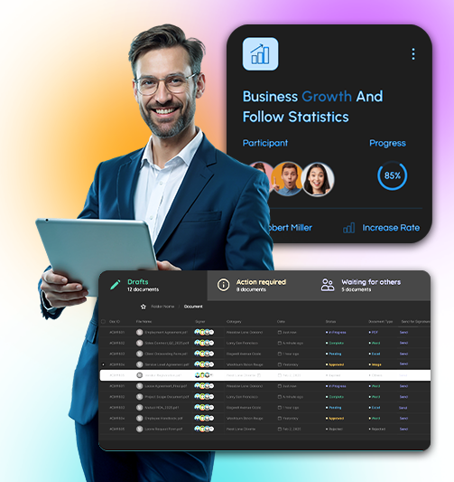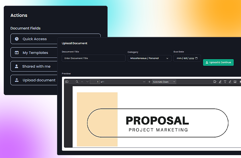 Use our templates or upload your own. Simply drag and drop fields to create perfect, professional documents every time.